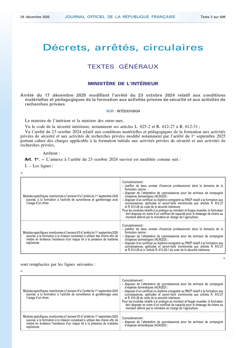 Le présent arrêté modifie partiellement celui du 23 octobre 2024 relatif aux conditions matérielles et pédagogiques de la formation aux activités privées de sécurité.